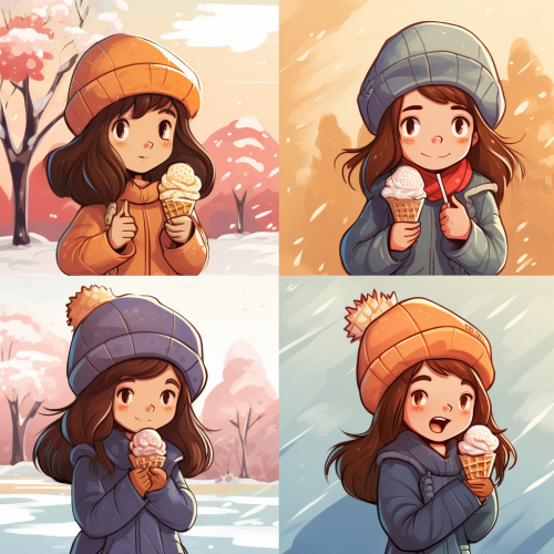 cartoon style scoops of ice cream in a waffle cone with a dark background, drips of ice cream