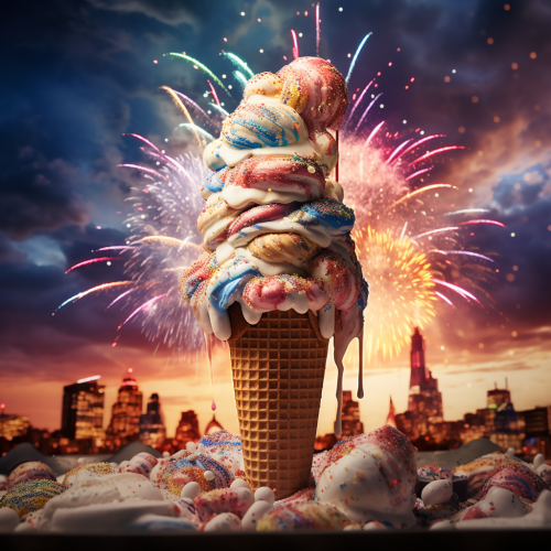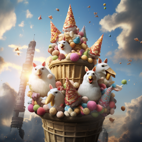 dancing ice cream cones with crowns on the top of a skyscraper with unicorns and chicken nuggets