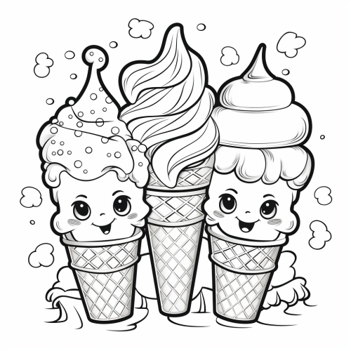 kids coloring page, black and white, no shading, bold clean lines, cartoon style, ice cream cones