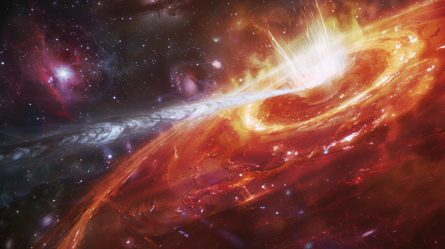 A large red star and a white dwarf connected by a glowing gas stream. The dwarf features a bright, spinning accretion disk, with energy beams shooting from its poles. The distant background is filled with galaxies and faint nebula, highlighting the cosmic scale. Created Using: cosmic realism, glowing energy transfers, multi-color accretion disk, vivid particle effects, high-energy beam rendering, nebula and galaxy backdrops, deep space details, high contrast --ar 16:9 --v 6.0