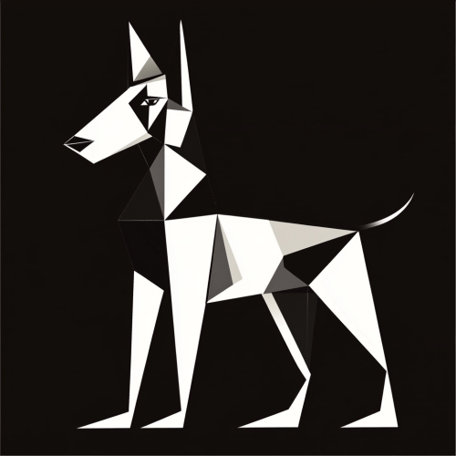 A black and white minimalist dog composed entirely of sharp, geometric shapes. The dog’s head is a square with angular, pointed ears made from triangles. The eyes and nose are cut-out negative spaces, small and geometric, adding detail without curves. The body is a solid rectangle with straight-edged triangles for the legs. The tail is a sharp, angled line extending from the body. The overall design is bold, high-contrast, using only black and white with no gradients or shading. The entire illustration feels tight and compact, with strong use of negative space