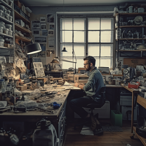 Picture a modern, open-concept design studio filled with diverse groups of designers working together. Large communal tables are scattered with sketches, prototypes, and laptops. On a wall, there's a vibrant mood board showcasing different design ideas coming to life, with team members discussing and refining concepts. The atmosphere is buzzing with creative energy, highlighting a shared commitment to success.