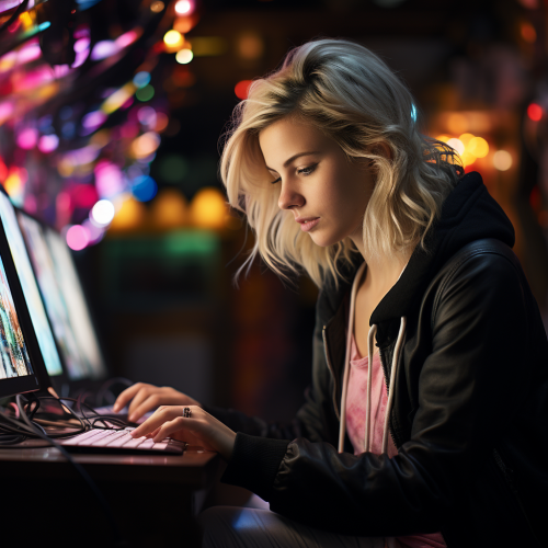 An innovative designer working on an exclusive project. Drawing and modeling a unique product or service. Stylish modern design studio. Black, white, pink, and neon green, symbolizing creativity and exclusivity. portrait photograph, heterochromia, dreamy, prismatic image, chromatic aberration, pearlescent colors and reflections, shattered in the mountains an image by kristin aaron reis, soft focus, faded modern enchanting photography, , eternal melancholy, rainbow colors, neon glitches, lights, and glass, meticulous detail,, Guy Aroch and Howard Behrens, 35mm --s 750 --v 5.2