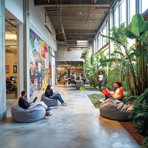 In a relaxed, unconventional workspace, designers are seen lounging on bean bags or working outside in a garden area, surrounded by greenery and open skies. Art materials are scattered across the floor, with vibrant colors splashing against the walls. The people are shown from the back or side, emphasizing their creative freedom without drawing attention to individual facial features.