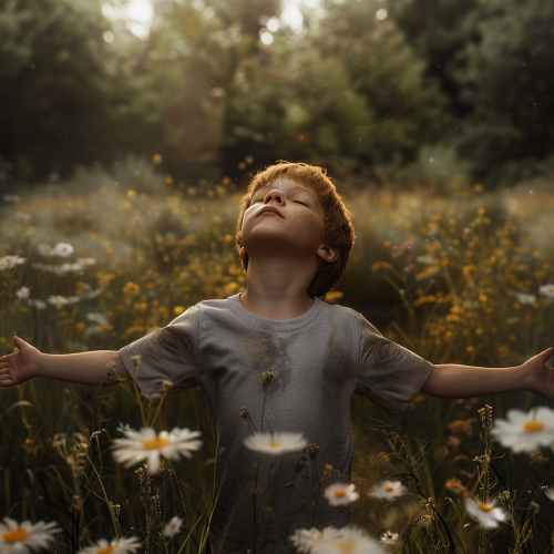 Child innocently standing on the meadow near forest and breathes deeply with arms spread wide and eyes open , camera facing slightly beneath him filming upwards from chest height, photo realistic, ultrarealistic