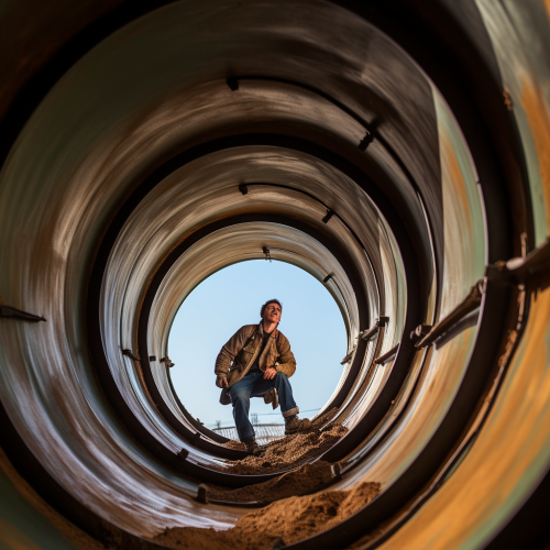 An abandoned industrial building, once covered with sand, but which someone found, cleaned, improved, and turned into a spacious living space. The room has a sofa, a hammock, a large graffiti on the wall, next to it is a work desk with city maps and marks on the wall, shelves with books and several flowers. Outside the window is an abandoned city covered with sand.