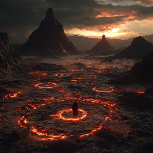 an enormous wide open landscape that resembles a vision of hell. Hellfire a destruction are everywhere. Evil red magical cult symbols are burned into the land everywhere you look giving the feeling of despair and damnation. Highly realistic. Dynamic cinematic shot.