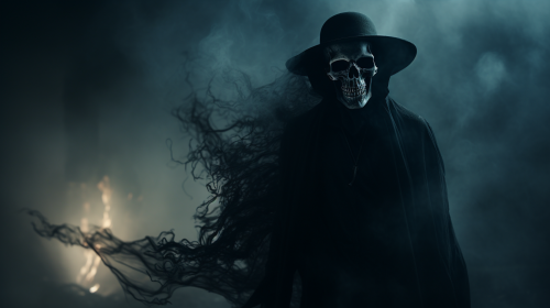 a personification of Death, a skeleton dressed in black and holding a scythe. He is semitransparent, his lower body disappears in dark smoke and darkness , his skull face emitting smoke, dark ambiance, horrific, foggy background, Super detailed, cinematic lighting, ultra high detail, 8K, volumetic light, ultra realistic, cinematic, dramatic --ar 16:9 --v 5.2