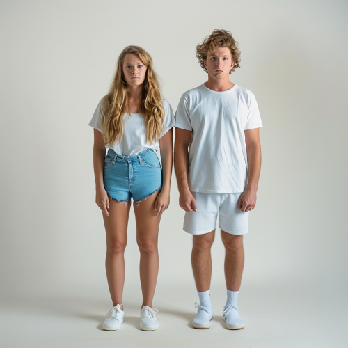 A hyper-realistic photograph of a female host with long blonde hair, white skin, wearing a basic t-shirt, blue shorts and white shoes. This woman is standing next to a male host with brown curly hair, white skin, wearing a basic white t-shirt and blue shorts with white shoes. --v 6.0