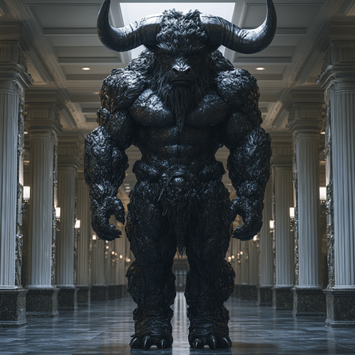 Head-to-toe shot of Asterion the Minotaur standing tall in a hallway with high black mirrorlike polished granite walls biomimicry, highly detailed, epic art photography, dynamism, Discombobulate, long exposure shot, Mirrorless, 12mm lens, low Wide - angle - - ar 62: 9 --s 750