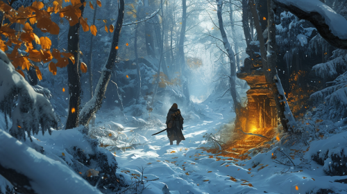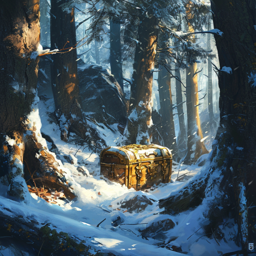 filled with golds treasure chests in snow covered forest , game concept art --v 6.0
