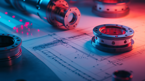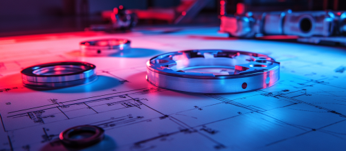 milled matt plastic flanges on a table with construction plan, industrial hall in blue and red light effect, photo realism 4K high contrast, super detailed --ar 16:9