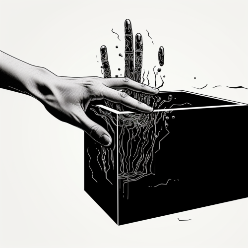 schematic image of a hand stuck in a black box on the side, black and white schematic image