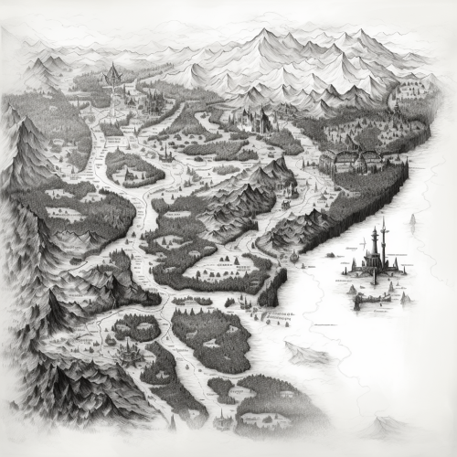 a scroll of a hand-inked map of a fantasy realm in black and white, white background, in the style of Dungeons & Dragon's spot illustrations.