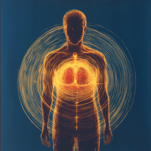 Hyper-realistic, high-quality image of a human figure standing calmly with a visible electromagnetic field radiating from the heart. The energy field forms a symmetrical, golden torus grid around the figure, illustrating the heart's magnetic field extending meters away. The chest area glows softly in warm red, while the torus grid lines wrap around the body in vibrant gold, creating a scientifically inspired aura. Soft blue background highlights the contours of the energy field, with detailed light and shadow effects adding depth. Studio lighting emphasizes the 3D quality of the field, blending realism with a touch of ethereal energy.