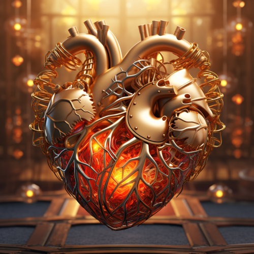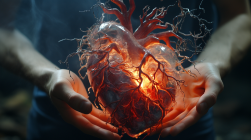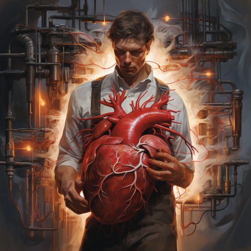 Create a hyper-detailed, ultra-realistic image of a robotic hand holding a holographic human heart. The heart should glow with a translucent, hologram-like effect, showcasing intricate details of veins and arteries. The robotic hand must feature sleek metallic components, sensors, and precision engineering, symbolizing advanced technology. The entire scene should be set against a dark blue background to enhance the contrast between the bright holographic heart and the robotic hand. The composition should evoke a fusion of technology and humanity, with perfect lighting, clarity, and depth, --ar 3:2 --s 750