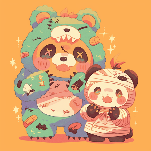 Cute and slightly scary little bear character and cute and slightly scary owl character, wearing zombie costumes, background is pastel orange, pastel pink, pastel black, pastel green detailed design, Japanese idol anime style, villain-like design --niji 6
