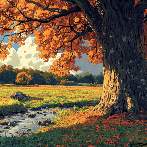 landscape of a french Forest during autumn, orange Colors, illustration, studio ghibli style, stream at the right of the image, big trunk of a oak in foreground --s 250