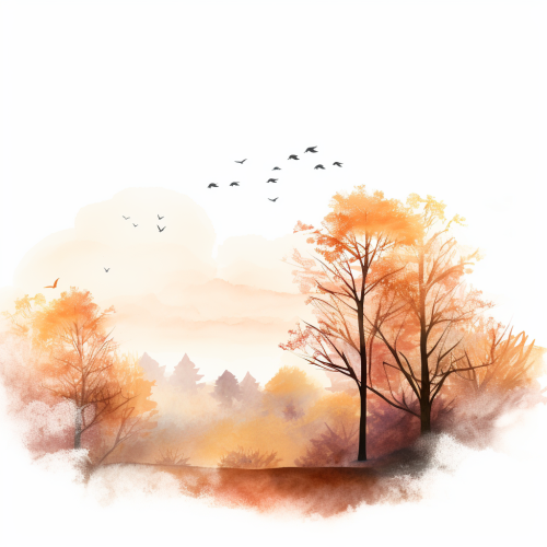 a watercolor illustration of an autumn landscape with bird silhouettes with on a white background, soft natural light, delicate and minimalist style , muted tones --v 5.2