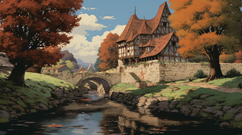 DVD screengrab, 1989 Studio Ghibli anime movie, desktop wallpaper, 1920×1080 px, landscape, magic, fall, scandinavian architecture, tudor-style village, farmland, pastures, farm animals, river, fantasy, autumn, red leaves, orange leaves, stone bridge over river, farm on the left, village townhouses on the right, --aspect 16:9