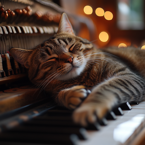 a cat lying on a piano, medium full shot, sharp focus, raw high resolution, ultra-detailed, natural lighting, brand photography style , brenzier effect, full shot, Fujifilm GFX100, --s 750 --v 6.1 --ar 1:1