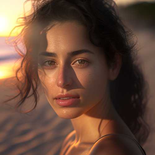 Hyperrealistic side portrait photo of hispanic woman on a beach, beautiful light rays, at Dawn, shot on a Sony mirrorless camera, 50mm lens--ar 9:16 --v 4