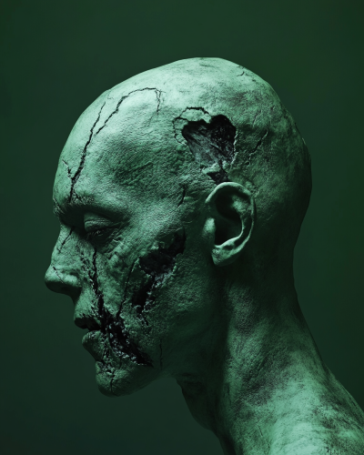 hyper realistic photo, spooky green portrait, zombie dramatic cutted head with scar, whitout body, well lit scene, front shot, ultra detailed --v 6.1 --ar 4:5 --style raw