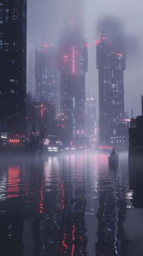 a hyper-realistic, photorealistic image of a dystopian waterfront at night, featuring symmetrical megastructures along the shore, rendered in ultra high definition 8K resolution. The buildings, made of reflective dark materials, stand stark against the calm, oily water that mirrors their harsh outlines and the occasional neon light flickers. Incorporate a foggy atmosphere with low-hanging clouds that obscure parts of the buildings, focusing on detailed reflections and sophisticated lighting effects to enhance the mysterious and atmospheric quality --ar 9:16 --v 6.1