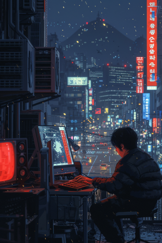 16bit pixelated akira sitting at a computer in seoul korea city night time, highly detailed, 8k, ultra detailed, par --no portrait --ar 2:3 --v 6.0