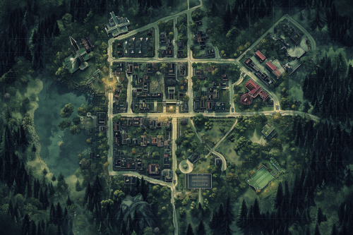 create a large battle map of a dried out lake, have it in dungeons and dragons style, have it in top down view, have it surrounded by trees, have some of the trees knocked down as if a meteor has fallen, have damage markings on the ground from where a meteor would have fallen. have a cave enternce in the middle of the dried out lake, have some large stones on the lake bed.