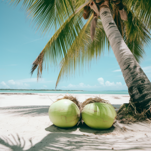 white beach bakcground with palms withGREEN YOUNG COCONUT