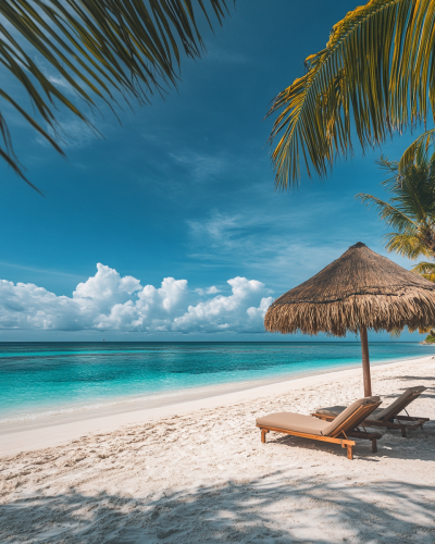 A beautiful tropical beach with white sand, palm trees, and lounge chairs under an umbrella on the left side of the picture. The blue sky is clear without clouds, and there is shallow water in front of it. In the background, you can see another island. This photo was taken by professional photographers using high-quality cameras and a wide-angle lens to capture the beauty of nature. --ar 4:5