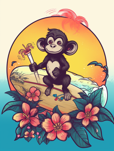 simple graphic of a cute cartoon monkey with surfboard, palm tree and hibiscus flowers in strong colors --ar 3:4 --seed 3000 --v 5.0