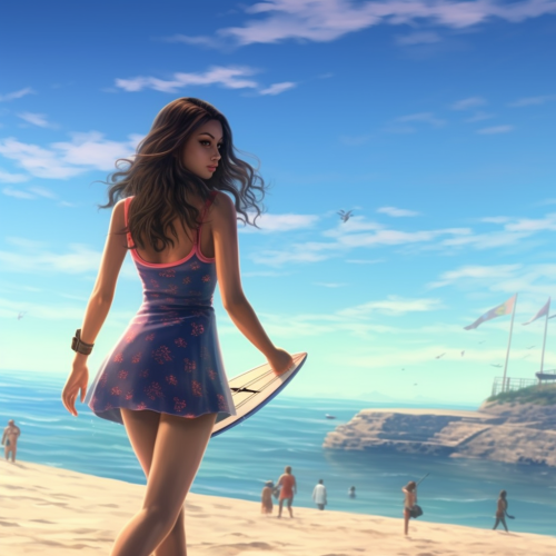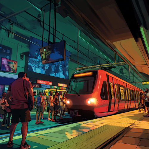 A vibrant wallpaper depicting a bustling metro station in Los Santos, with a metro train departing, illustrated in the exaggerated Grand Theft Auto V art style. The scene captures a diverse crowd of people waiting on the platform, showcasing various characters in dynamic poses, from commuters to tourists. The metro train is sleek and colorful, speeding away, while the station features bold advertisements and graffiti, adding to the urban atmosphere. The lighting is bright and lively, reflecting the energetic vibe of the city. The artwork showcases bold outlines, rich colors, and a cinematic feel, embodying the lively spirit of GTA V.
