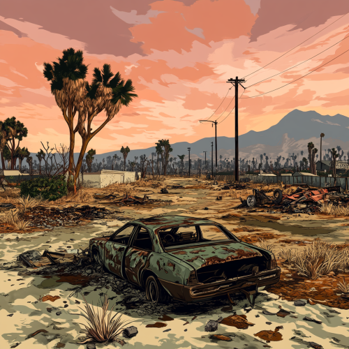 A desolate landscape in Sandy Shores, depicting a burned-out car surrounded by extensive destruction, set in the vibrant and exaggerated Grand Theft Auto V art style. The scene features charred remnants of vehicles and debris scattered across the ground, with scorched earth and wilted plants struggling to survive. In the background, resilient trees and sparse vegetation contrast with the devastation, hinting at nature's persistence. The sky is painted with dramatic hues, reflecting the aftermath of chaos. The artwork showcases bold outlines, rich colors, and a cinematic feel, capturing the stark and haunting atmosphere of GTA V.