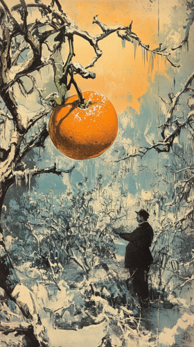 a 1940s propoganda poster of a farmer inspecting an orange on the vine of a tree. There is frost on the orange and all of the rest of the orchard in the background. The farmer has an expression of concern. --ar 9:16