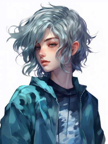 blue turqoise aquamarine teal, student woman, bobcut tomboy hairstyle, baroque, hirohiko araki style, fantasy, casual clothes, --ar 27:36 --no plain background