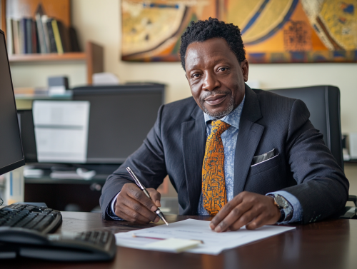a black African Art expert, 50 years old, wearing a suit, in his office, reporting an authentication case with a pen, a computer is on his table --ar 4:3