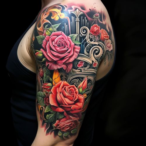 the Detroit Old English D with colorful roses coming out of it and looking ultra realistic. Make the D also have a glow of Crimson in the background