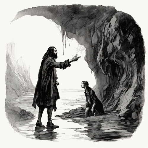 ink drawing. a devil man pointing to a woman in front of a cave, the woman turns into a river