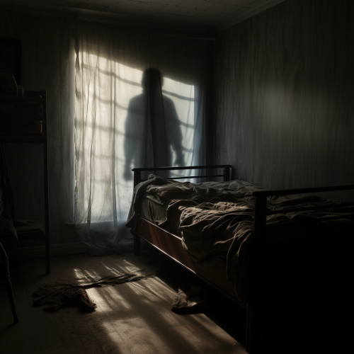evil shadow rising up from the floor in an abandoned bedroom, dark and sinister