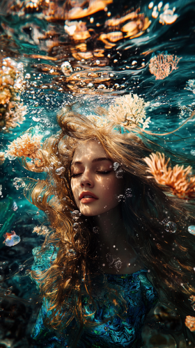 Una mujer joven con el cabello largo y ondulado que parece fundirse con las olas del océano. De sus manos emergen corales brillantes y criaturas marinas como medusas y delfines que nadan alrededor de ella. El fondo es un cielo estrellado donde las constelaciones reflejan en el agua. Estilo surrealista con detalles en tonos azules y verdes, luz suave que atraviesa el agua creando reflejos etéreos. --ar 9:16 --q 2