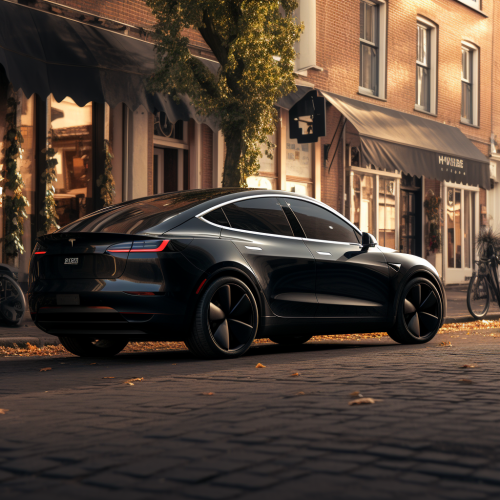 photo realistic black colour Testla model Y with Vossen wheels 23 inch showing right side of car, background of a typical dutch street, high resolution, with visibile details, beautiful light in a width view 4k 16:9