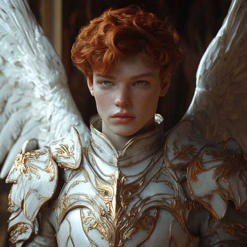 Heartbroken and depressed but determined Archangel general. She is about 30 years old. She has massive white wings, long red hair, and deep blue eyes with a soft glow. She looks like Eva Green. She is wearing elaborate golden Renaissance valkyrie armor. Epic. Dark Fantasy. Baroque style.