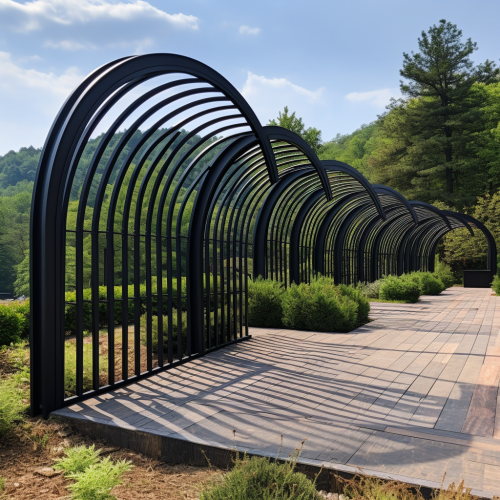 A flat, matte black metal fence with thin bars composed of several overlapping nested arches of different sizes. A pleasant zen garden can be seen beyond. View from front.