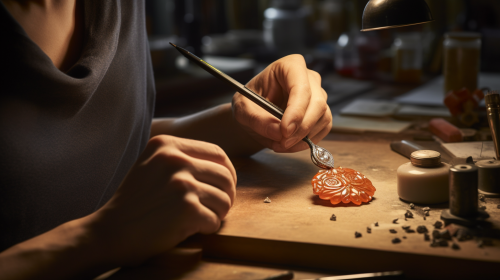 realistic, close up on a hand of a jewellery designer, painting the last touches on a scetch for an amazingly designed necklace, shot on sony a7siii with 35mm f1.4 lens, --ar 16:9