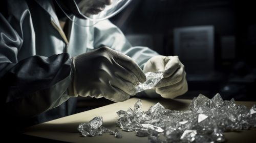 A diamond dealer, exuding a blend of caution and excitement, holds a parcel of gleaming diamonds, standing confined within the tight space of a mantrap at a high-security diamond facility, The dealer's eyes, sharp and calculating, reflect the shimmer of the precious stones in hand, offering a stark contrast to the industrial, metallic surroundings of the mantrap, The surrounding steel doors, massive and imposing, frame the dealer, accentuating the significance and value of the glittering cargo he possesses, Photographed by Sebastião Salgado using a Leica M10 and a 35mm Summilux lens, Award Winning Photography style, Chiaroscuro lighting highlighting the sparkle of diamonds against the grim, metallic background, 8K, Ultra-HD, Super-Resolution, --v 5.0 --ar 16:9