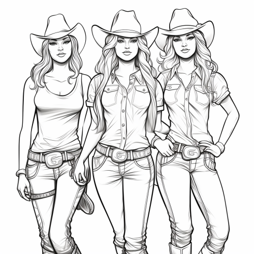 coloring page, Create detailed drawings of cowgirls in different poses and outfits, highlighting their beauty and determination. simple, bold lines, black and white, bottomless, line art85:110