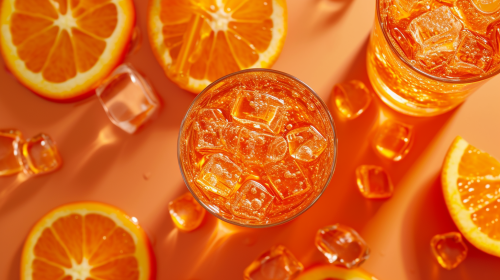 Birds eye view of fizzy bright orange Fanta liquid drink with ice and slices of orange floating, macro full frame sharp focus photography, close up zoomed in, commercial advertising --q .5 --ar 16:9 --v 6.0