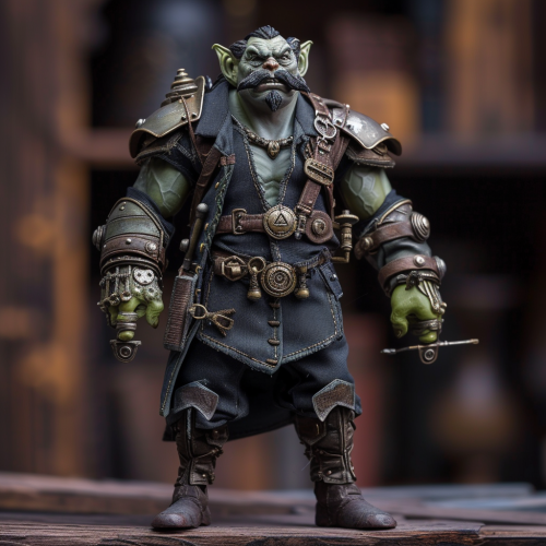 a full body shot of a McFarlane Toys style action figure of a male orc in a Victorian steampunk outfit, goatee and handlebar mustache, articulated arms and legs, photorealistic, professional photography --v 6.0